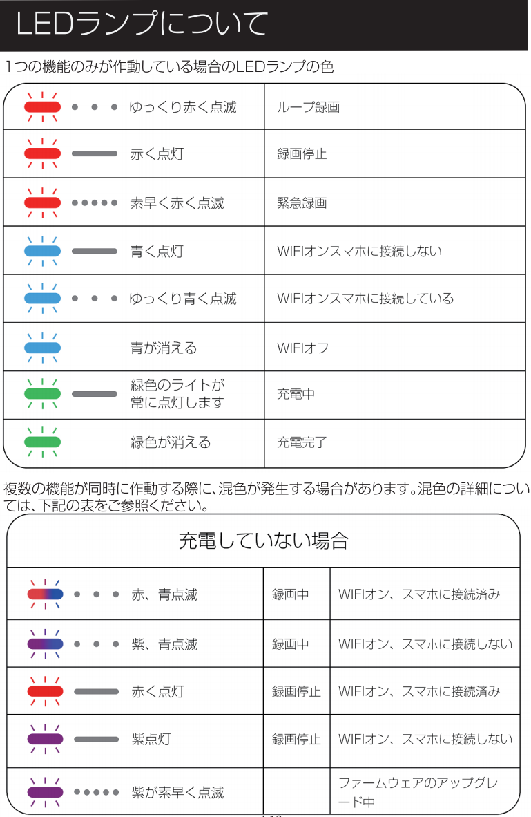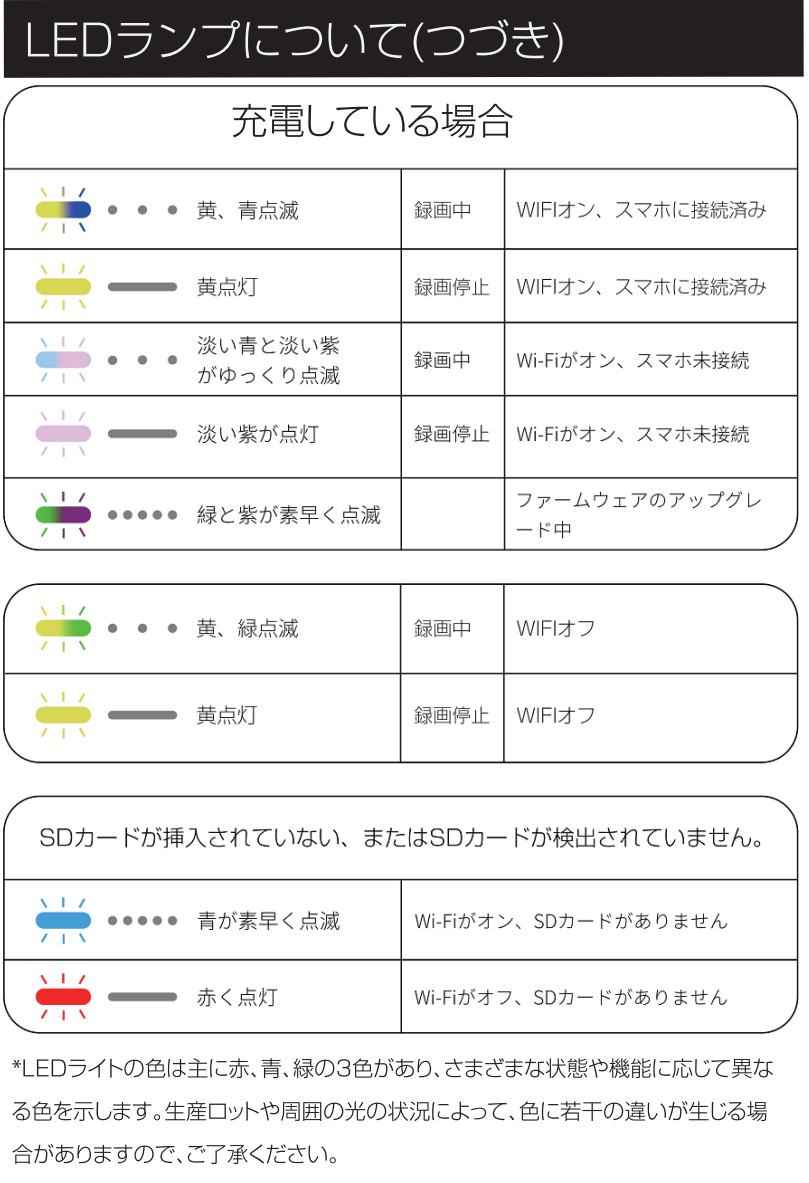 説明書に記載されているLEDカラーは、外部電源未接続時の表示に基づいています。 外部電源を接続すると、緑色LEDが他の表示に重なり、実際には異なる色に見える場合があります。 例えば、録画停止時の赤色表示が、充電中の緑色と重なり、肉眼では黄色っぽく見えることがあります。